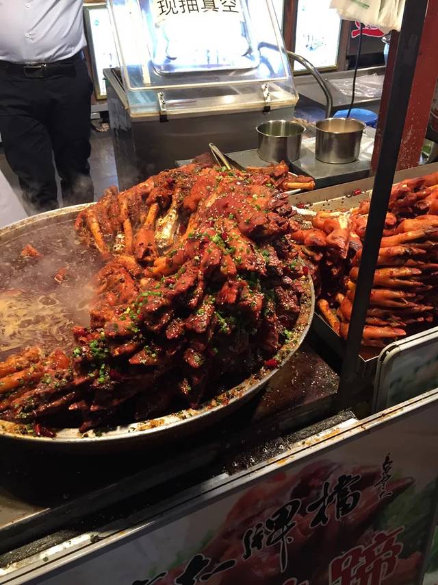 路上正好遇到一条街,全是卖吃的和纪念品之类的。我们吃了点东西:铁板鱿鱼、酸辣粉、烤鸽子腿,价钱也基本上都是10元一份,然后去走着去看音乐喷泉,只需要穿过一个公园就行。路上看到卖冰糖葫芦的,才1元一串,而且吃的还行。