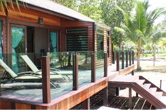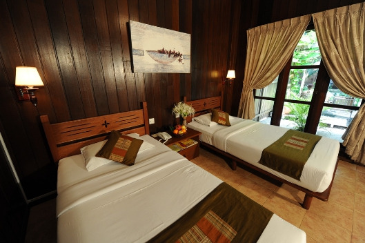 豪华木屋坐落在岛中央奇异花园里的,四排座地式的客房,有两种房型,一种是deluxe room,共12 间,房号D1-D12;一种是premier deluxe room,也是12间,房号PD1-PD12。