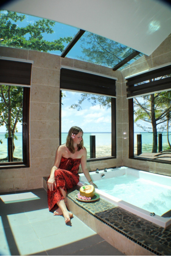 沙滩木屋面积比较大,除了一张大床外,还有一张独立的小床,适合一家三口亲子游。室内带有一个超大按摩浴缸,一边泡澡一边享受绝美的海景,也是极佳的享受。