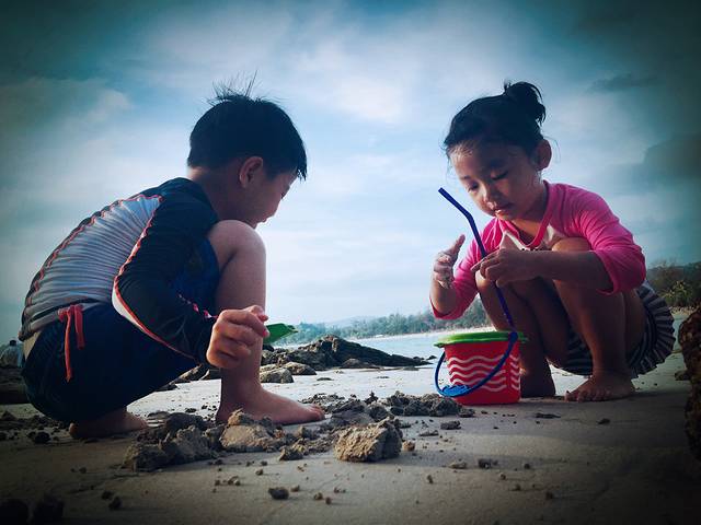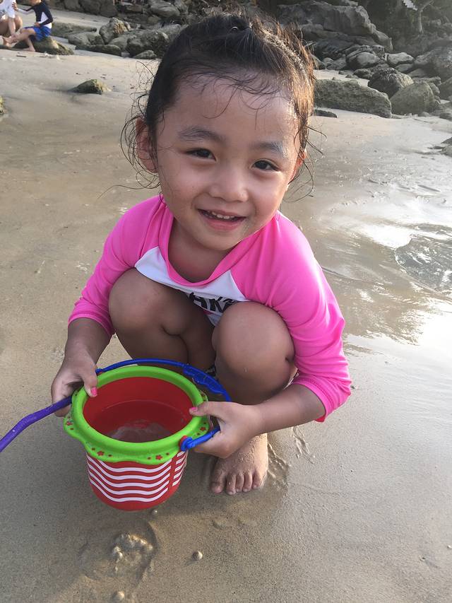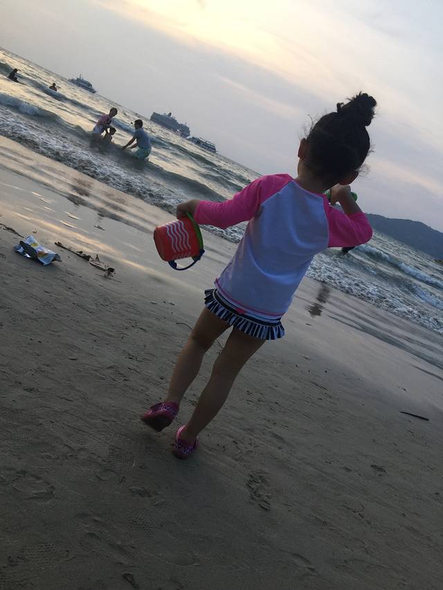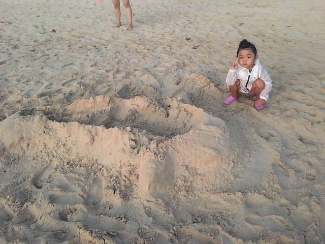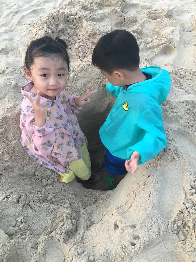晚上带着装备去海滩,孩子们已经没有往海里蹦的兴趣啦,开始挖沙子~