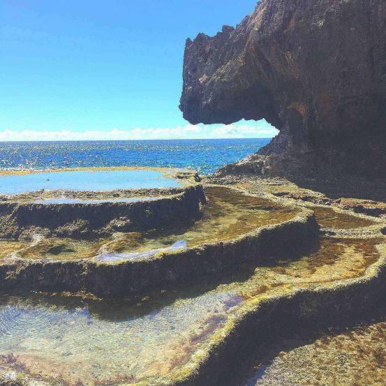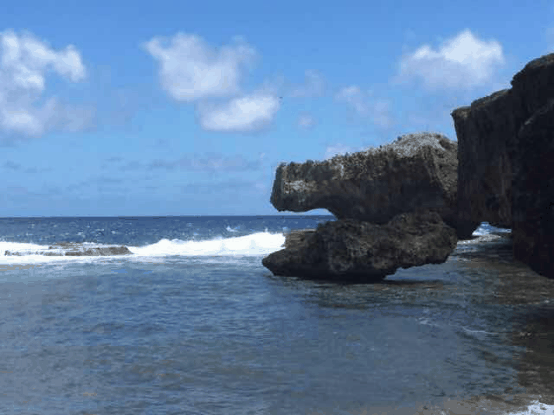 在海边的一处有特色的岩石,就好像一只很渴的恐龙在喝海里的水一样,生动形象。