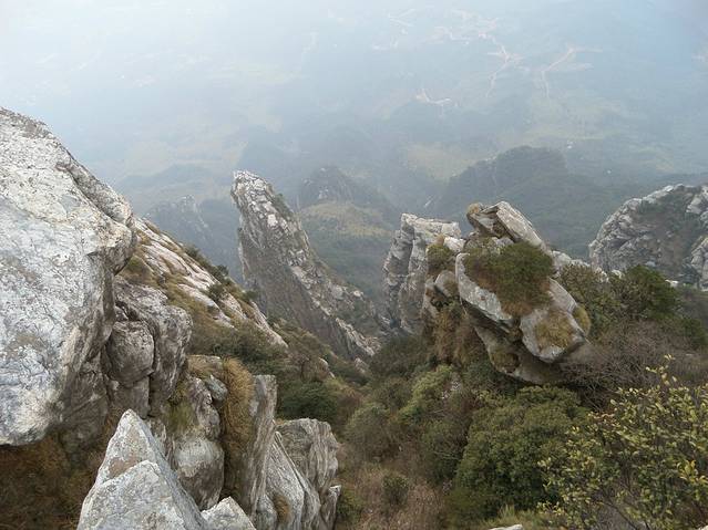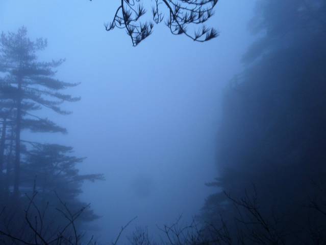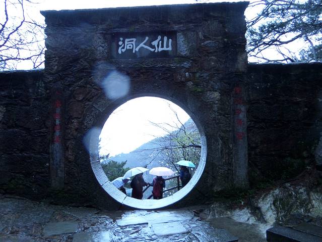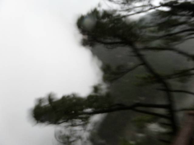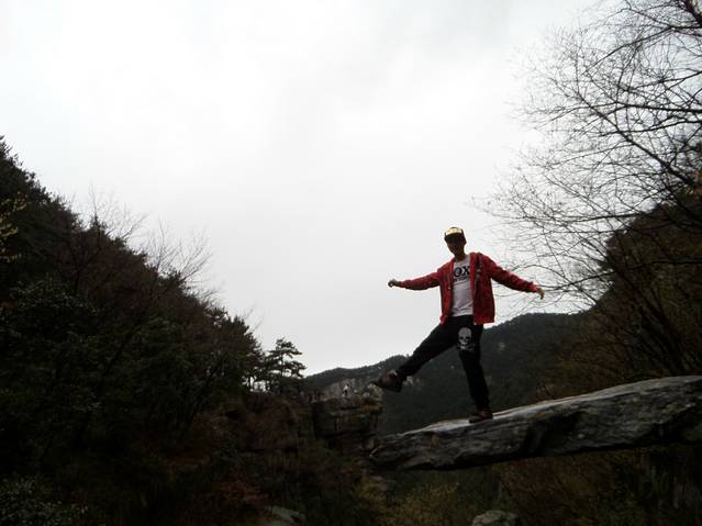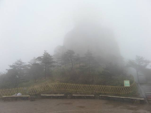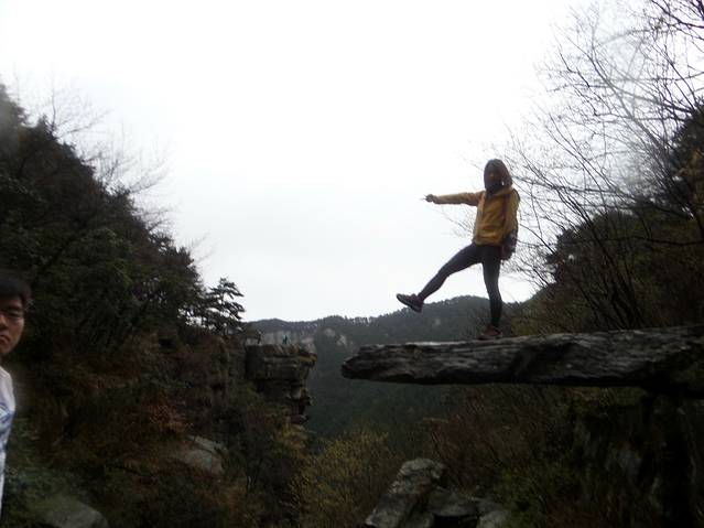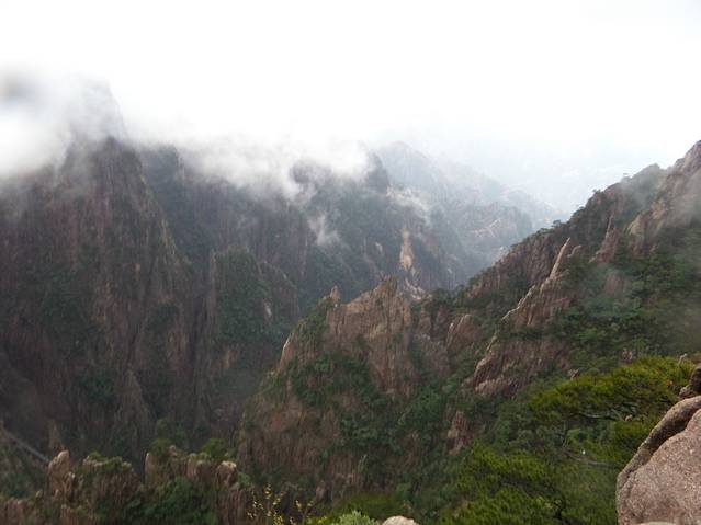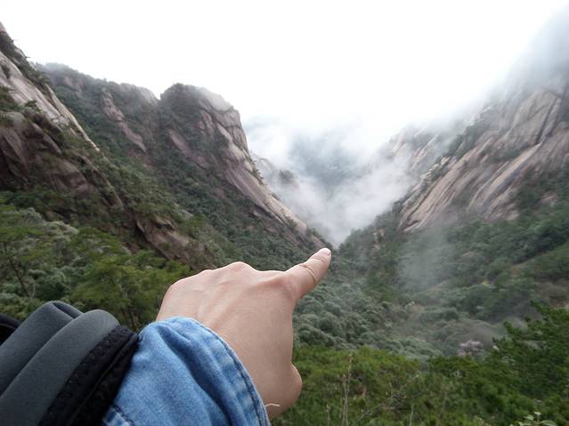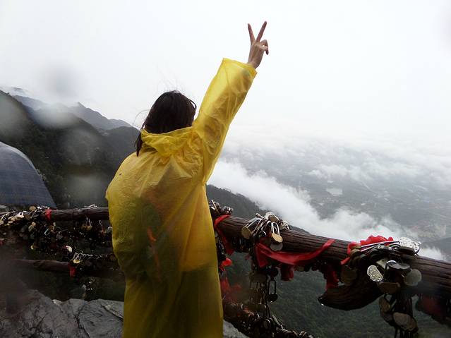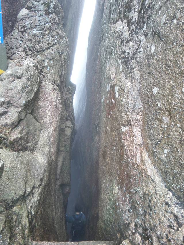 4月3号早上七点半左右出门,走西线,直接下锦绣谷。走了天桥,遇到几个朋友帮忙拍照挺好的。拍完照片一路往下走,有好运石,碰到旅游团从下面爬上来。再往前走一小段,前一秒还在欣赏锦绣谷的美景,突然就变天了~雾气瞬间弥漫整个锦绣谷,狂风暴雨即刻袭来。我站的地方刚好有个大石头,挤了好多人在那里避雨,我呢又想抓景,一下来不及,仅仅穿上了雨衣,豆大的雨便打了下来,风特别大,吹的悬崖边上的树不停摇摆,看着觉得挺恐怖的,天也黑压压的。我开始是站着的,看着实在不行了,就蹲下来,才短短几分钟,我的鞋子和小裤腿都湿了。哎~忘记买鞋套。鞋套不能穿来爬山,下雨时套一下还是可以的,鞋子不会太湿。雨慢慢小了,也没风了,但还打雷。旅游团的导游说让旅游团原路返回,说前面是雷雨区不能走了。我很犹豫,不去有点不甘心啊。等旅游团的人都走了,发现还有个大哥没走,我问他会不会往下走,他说走,我问能一起吗?说实话,这天气,我要是一个人走真有点怕~