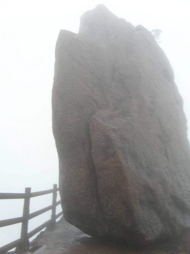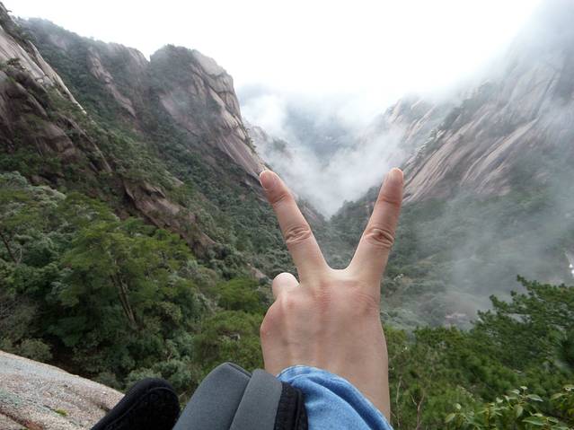 前山爬到半山寺时,花了可能一个半小时,这个位置可以看到老人峰。此时看到天都峰已经开放,便决定要爬上天都峰。天都峰上山真的是陡峭,恐高的童鞋不建议爬行。我们到天都峰顶已经是下午2点过,终于登顶了,可是周围一片白雾茫茫,除了山顶那块石头的几个人,啥也看不到。我们都是大眼瞪小眼,都不走,为啥?等着看云海,有对小夫妻等了一个半小时了。可能耐心也快用完了,就在他们背包准备离开的时候,一阵大风刮来,白雾瞬间散开,看到云海了!!!大伙儿都好高兴,可是只有几秒钟,我也狂拍,不知道拍的啥,说实话!但又等了一会儿,陆陆续续又出现云海,此时从山顶山谷眺望,黄山一片壮美,真的黄山归来不看岳!我只觉得这一路的辛苦,真的值得。