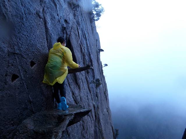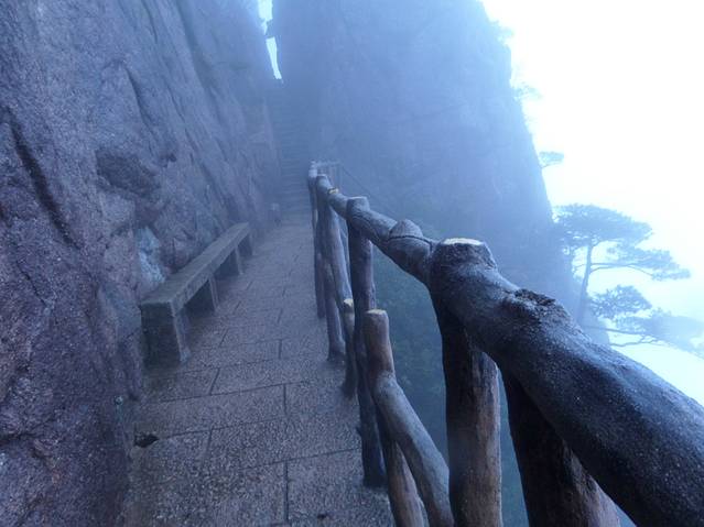 在天都峰顶看完云海,要继续往前走了~就会走到玉屏宾馆,也就是缆车在山顶的位置,也是迎客松的位置。在这段路中,有一段悬崖的路,感觉好刺激…