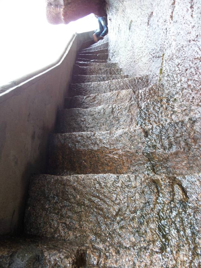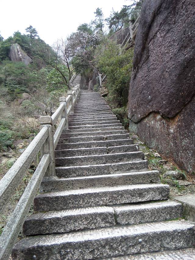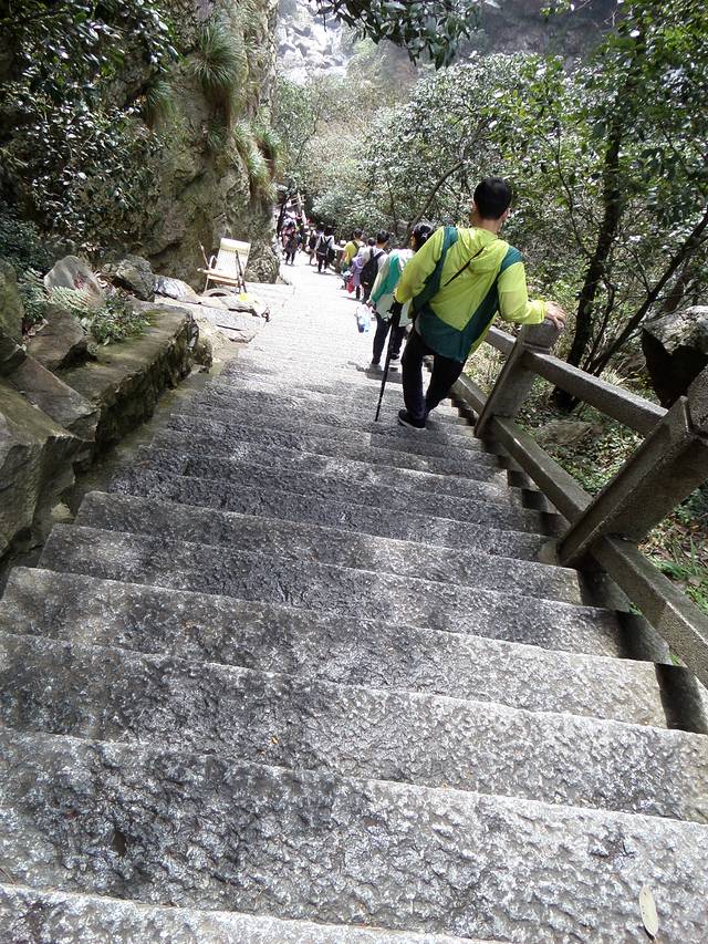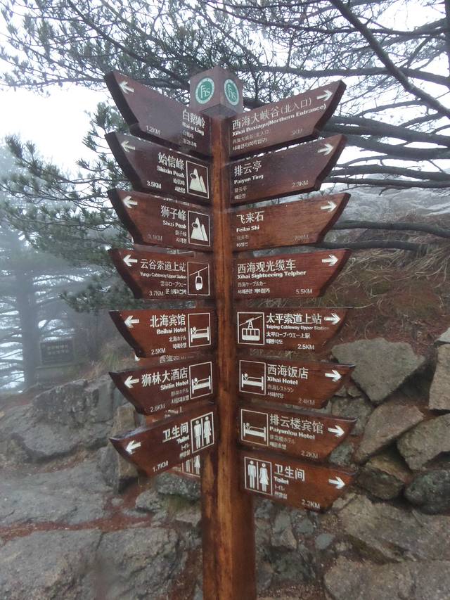 我们本来想如果时间不够,就坐地轨回白云宾馆。可是一看时间充裕,二话不说,走西海大峡谷上行到步仙桥。这段走的有点辛苦,比较陡峭,而且当天没人走,又没有指示牌,爬的都有点绝望了,互相鼓励坚持着,我们爬了两个小时多,才终于到步仙桥,看到指示牌时特别兴奋,觉得有希望了。然后休息一下继续向前,最后到白云宾馆附近,我们一共用了2小时45分完成西海大峡谷—步仙桥的上行线,觉得黄山这趟圆满了!在白云宾馆稍作休息,12点20分开始从后山往下走,因雾气特别重,啥也看不到,而且还在下雨,只能一心下山了。后山平坦很多,几乎是一路奔跑往下的~因为这两天一直下雨,水量超足的,所以下山时看到了好多条小溪流小瀑布,简直看腻了。下山花了不到两个小时便到了乘车的位置。买票坐车,回黄山市区。晚上去老街随便转了一下,也没什么看的,商业化很重。都是卖特产。
