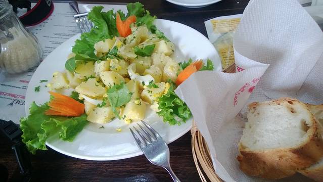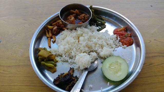 尼泊尔第一餐,在去往加都的盘山路边的小餐馆吃的,250Rs一份,辣酱很辣,烤苦瓜很黑暗料理,鸡和鸡汁倒是不错
