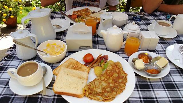 美好的尼泊尔早晨从酒店的美式早餐开始,一份30元人民币左右,内容如图,这里咖啡很诡异,倒进牛奶后牛奶都会结块,味道也不好