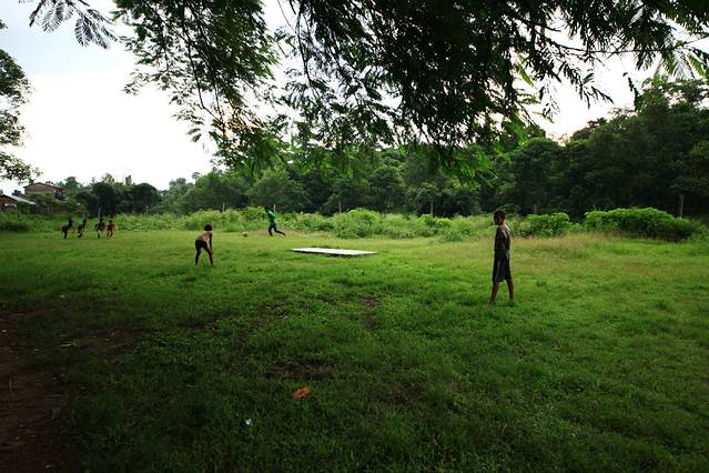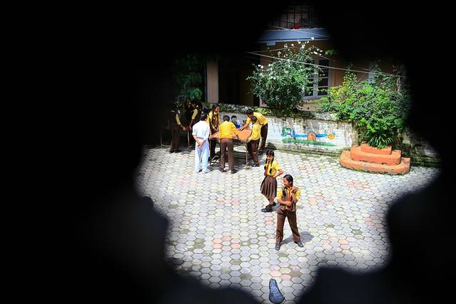 我们住的酒店和当地一所小学只有一墙之隔,透过墙上的镂空花纹可以看到他们在上体育课