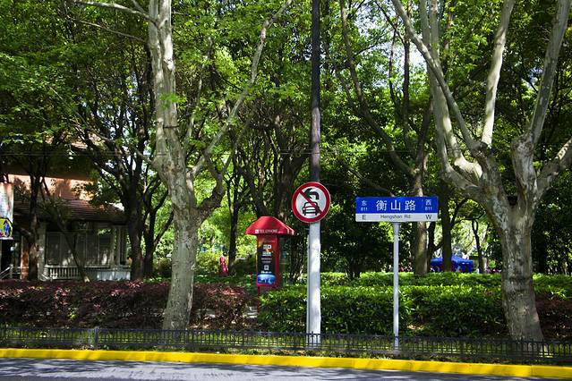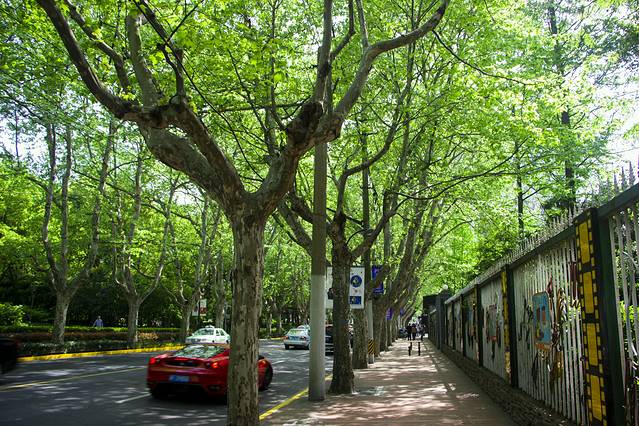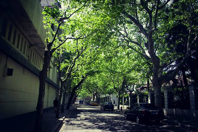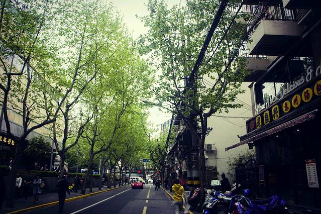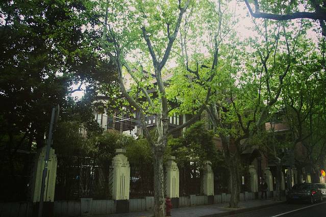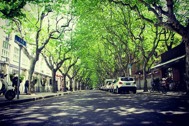 过了路口就是衡山路了。北京的三里屯,上海的衡山路,都是有名的酒吧街。欧洲风格的洋楼,红色的屋顶,青翠的梧桐完美交织,绝对是感受夜上海魅力的好去处!可惜时间不够,白天来的