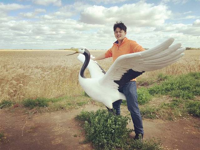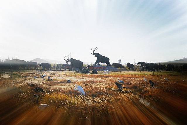 到了扎龙自然保护区啦,游客们纷纷和门口的石碑、丹顶鹤雕塑合影。某人也跳过去,让我帮他拍,虽然我是不懂,等会就有真的鹤,还拍假的干嘛……