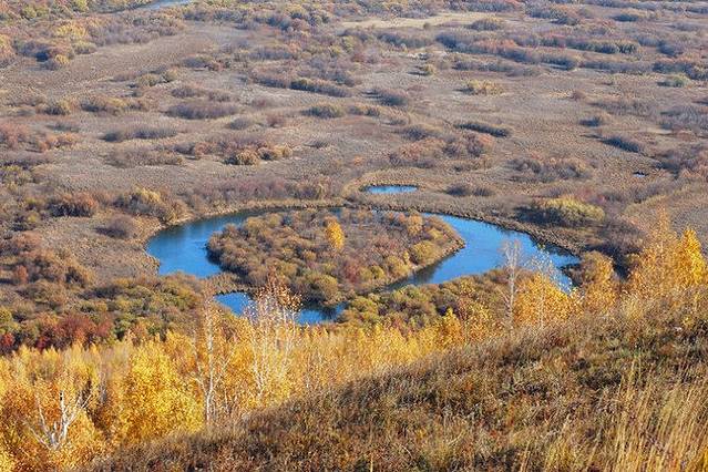 湿地到了秋天,也呈现出黄绿红的色彩,加上蜿蜒的河道,像不像彩带呢?