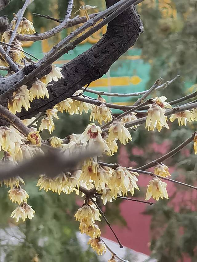 盛开的腊梅花瓣黄色,花蕊暗红。像是极其油润的田黄石印章,透过阳光又像琥珀之极品血珀。方寸间的小花却开的挤挤挨挨,在冬天为人们传递春天讯息。兼有丝丝缕缕的馨香,浪漫在古寺空气里,若有若无,忽浓忽淡,悄悄地送进心灵肺腑,顿觉周身舒泰,三万六千五百零一个毛孔的懒洋洋张开来。