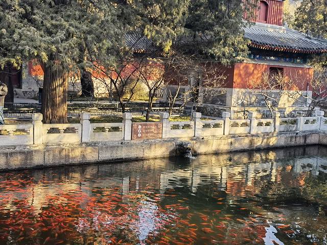 穿过山门抬眼即是放生池,红红的金鱼如同水中繁花盛放。石雕龙头中活水汩汩流出,动静相宜。池边几株腊梅,背风向阳,挤在一起已经开的热热闹闹啦!