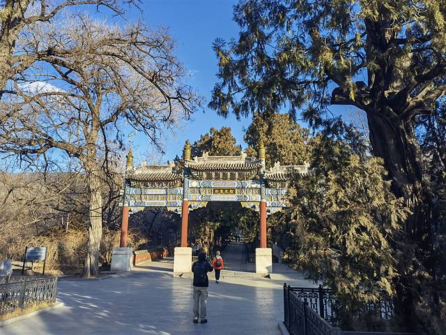 建于清乾隆年间,四柱三间七楼单檐歇山黄琉璃瓦顶,饰以黄绿琉璃瓦,华丽精美五彩斑斓,突出的表现了清代皇上家寺院的恢宏气势,牌坊上镶“二龙戏珠”琉璃图案栩栩如生,牌坊正面镌有“同参密藏”四字,