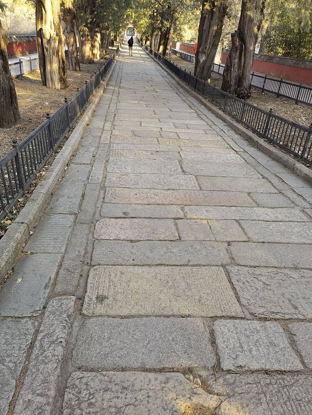 朝山还有一段上坡路,百米长的古道颇有沧桑。古柏森森都是三百余年的老树,两溜儿红墙夹着中间石板路,还是几十年前儿时印象。