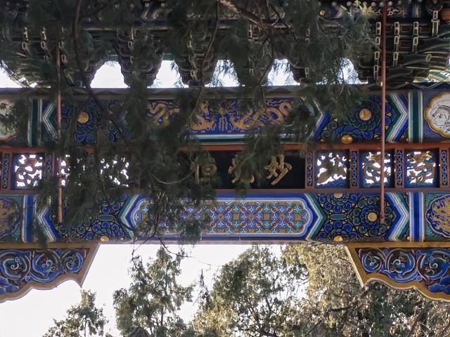 卧佛寺是园中园,从植物园东南门进入,迤逦而行大概两公里,远远望见古树掩映的大门牌楼。