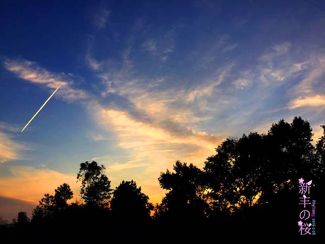 此时已经夕阳西下,又有飞机划过上空留下的痕迹,异常动人美丽。