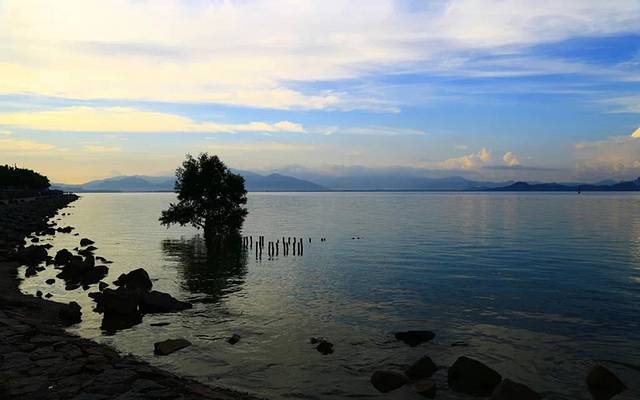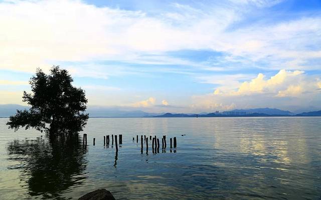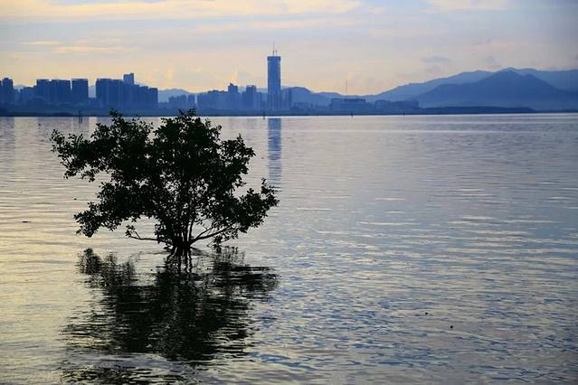 一棵红树在屹立在涨潮的海中,这张照片好有意境吧?