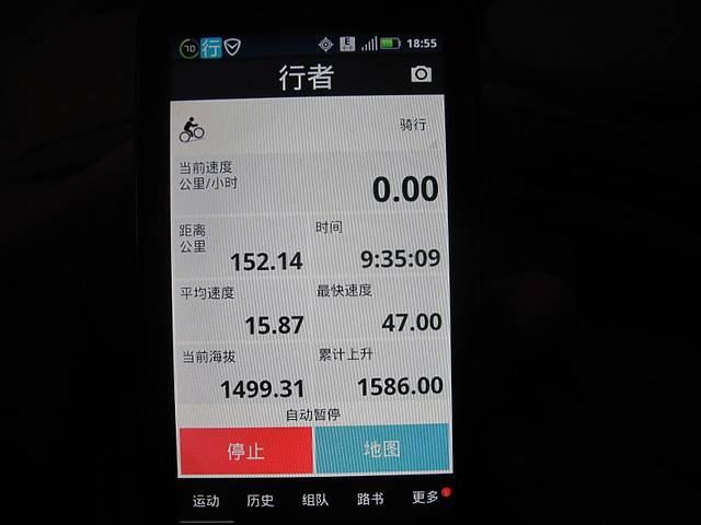 第一天骑行152.65公里,骑行时间9.6小时,平均速度15.89公里/小时,最快47公里/小时。海拔范围1438.18-2039.01米。