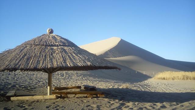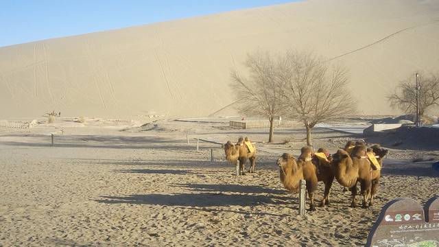 然后坐公交到市中心,再转公交到鸣沙山,当晚可以选择订那附近的客栈,夏天的时候,还可以租个帐篷夜宿鸣沙山,听鸣沙声,赏星星赏月亮。租鞋套要15元,我觉得没必要,我租了,后面的时候,把它脱了,然后用把鞋也给脱了,亲密接触大漠。骑骆驼100元,舍不得花这么多银子,现在后悔。