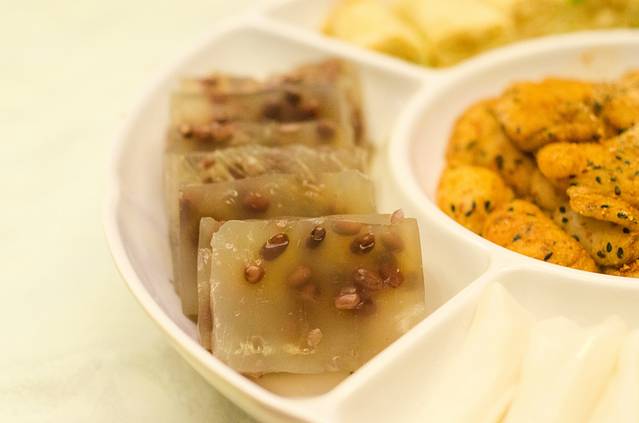 这个类似于土笋冻了,但是用料的植物类的食品,米粉与红豆合成一起做成的,很爽口的哦。