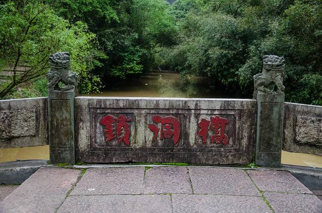 这座横跨桃花涧的石拱桥叫锁洞桥,桥的柱上盛着大桃子,此桥横贯幽谷,两岸桃树成林,颇有几分诗情画意,特别是桃花开时,可见小桥流水、桃花夹岸、漂花满涧,徜徉其间,韵味无穷。原桥系明万历年间陈源湛所建,早已损毁,后于1988年重建。桥下有一石头形似巨龟,把守洞桥,“锁洞桥”因此得名。