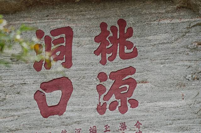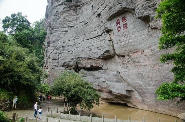 特殊地貌形成两边悬崖对峙,这条小涧叫桃花涧,从景区深处流出,我们的游路也将沿着高山峡谷的缝隙向内延伸。桃源洞本没有“洞”,无论是步行,还是泛舟游览,都给人一种洞口的感觉右壁的悬崖高达120米,“桃源洞口”四个大字刻在36米高处,是明万历年间,辞官回永安的名士陈源湛于公元1605年所题,每字两米见方。下面小字每字也有50公分见方,是陈源湛写的一首七律《桃源洞》诗: