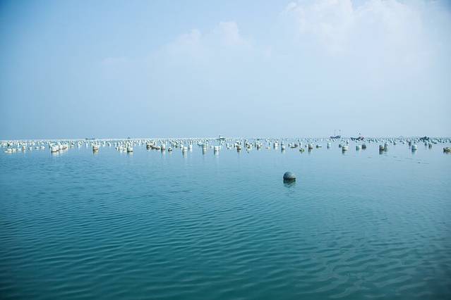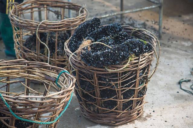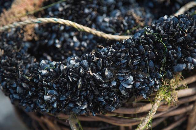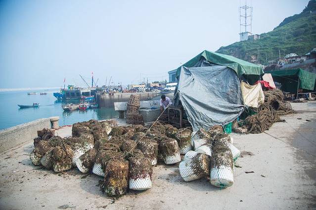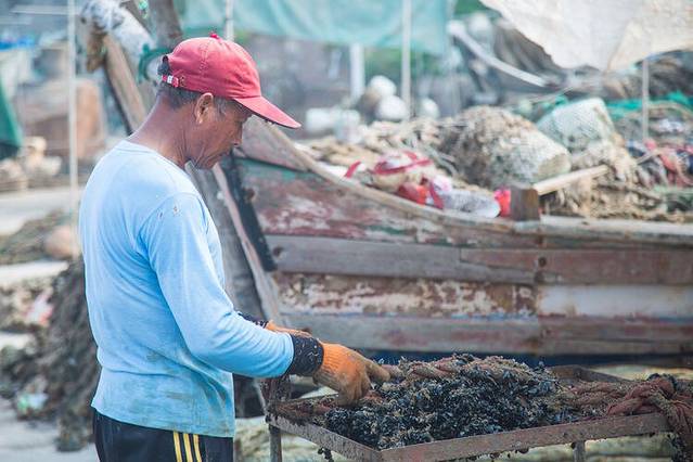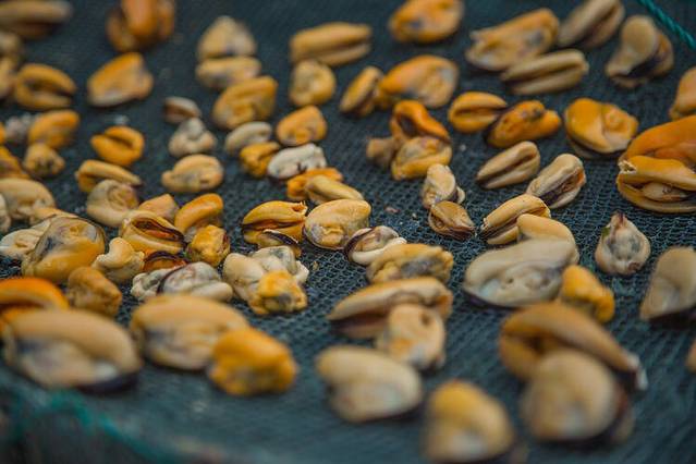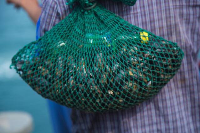 这个就是刚刚捞上来的贻贝,大街小巷都是这个,把绳子包上渔网放到海里,捞上来的就是密密麻麻的小贻贝,然后渔民们把它们拿回去养大