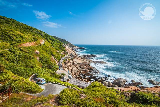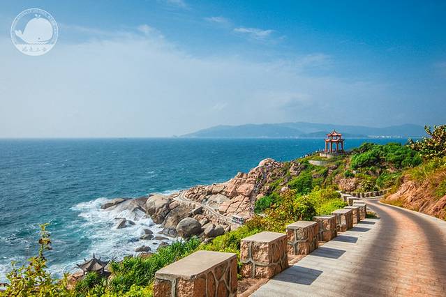 游览车上的司机是一路讲解过去的,对蜈支洲岛的了解又深一步了,数据性的内容我就不复制黏贴了,感兴趣的自行百度即可,我们继续说旅行。之后两个景点我有点想吐槽(妈祖庙、私人定制淡水泳池),还不如不要去,让游览车带着我们在这个区域多转悠一会,因为行驶过的地方,也是那么让人神往。如果不能理解之前我说的这条路所在位置,可以参看下面这张图,切切实实的建在崖壁上,临着大海。