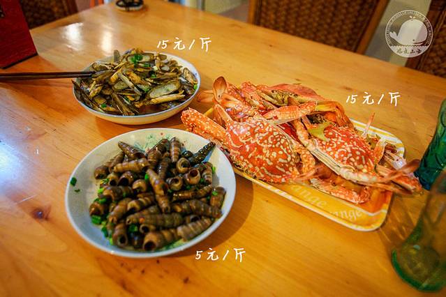 哦,开饭开饭。清蒸和乐蟹实在有点寡淡,陪着老爸的秘制酱汁,还是不错;葱油大对虾的口感超好,有葱油哦~竹蛏呀,活的时候很肉麻,吃起来味道是很鲜美的啊!听着潮声,看着日落,冰镇啤酒,饕餮大餐,完美(请自行脑补黄祖蓝模仿金星的动作)~