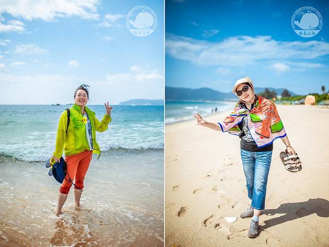 我们五个人光着脚丫,有说有笑,踩着柔软的沙滩,在沙滩上留下一长串脚印。一年前去过厦门(详见我另一篇游记——厦门 • 走一走),也是每天不倦的踩沙滩,踩的不亦乐乎。那相比之下,三亚的沙滩沙质细腻柔软许多,一点都没有扎脚的感觉;大海也是三亚的干净蔚蓝。
