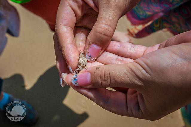 小螃蟹不是时刻都有的哦,大家记得算准潮汐。到海潮退到低谷或者正准备从低谷涨回来的时候,沙滩上的螃蟹特别多!因为螃蟹的巢穴基本都在挖在沙滩的下边(接近海水),涨潮回来就会被海水没过,退去的时候就各种出来活动。小东西灵活的很,不过依旧逃不过我的妙手^^
