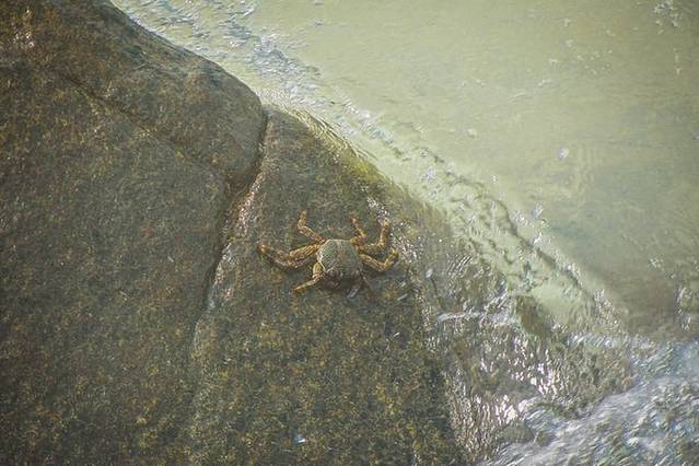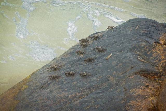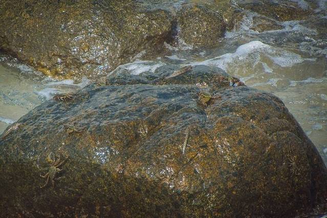 沿着观海长廊先进你会发现礁石上爬满的螃蟹,而且除了螃蟹,还有…呃…跳跳鱼?真的是诶,要不是它们一跳一跳的,还真没发现。这会儿涨潮时分,海水一层一层的叠上来,螃蟹在海水淹没礁石前还在做着最后一丝努力,纷纷爬到礁石的顶部,享受着最后一丝空气。所以我们能拍这样成群成群的画面,诶~~~我已经想到鱼蟹汤的鲜美了…