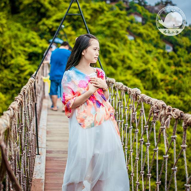 结果到地点一看,人从众,你懂吧~大家都是赶着走的,前后两人之间相差不超过1米的距离。于是机智的我们故意走的慢一些,我在最前面,张猫猫在第二个,爸妈阿姨三人垫后,每个人之间都空开1米的距离,慢慢走向索桥中间,这样只要后三人紧凑一些,那就能给我腾出足够的拍摄空间了,我简直是智慧的化身啊^^ 这不,还没走到索桥中间,我们就试验了一下阵型,堪称完美~