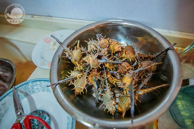 然后就是花螺,这个花螺你要是不准备个钳子把它尾部钳掉,就会错过它肉后部分绝美的膏,醋里放点鲜酱油,再少许一点芥末搅拌均匀,这种酱汁沾沾,完美!