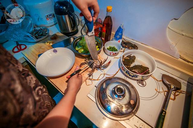 相比逛免税店,老爸老妈还是逛菜场更能提起劲来啊。又到了买菜时间,第一市场里各种血拼买买买,看来今晚又是一顿丰盛的大餐^^ 又是只见过样子,叫不出名字的海螺,还有名震江湖的和乐蟹。和乐蟹的头盖里都是膏啊(详见我前面第一市场章节的图片),这么壮自然也特别威猛,老爸一个不小心就被钳了手指,瞬间飙血啊,不上图了,脑补下就觉得疼…所以别看图上我们吃个螃蟹还剪刀+菜刀的兴师动众,其实是我们我们祭出了江湖上失传已久的杀蟹必杀技(* ̄皿 ̄)=Σ口>=Σ口>=Σ口>[火箭筒,发射!] 如图…
