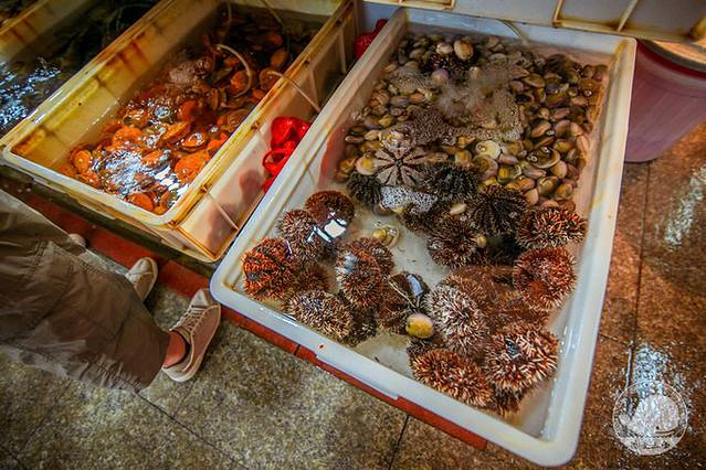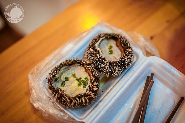 再看过来就是海胆,海胆也绝对是值得一吃的海鲜,8元一个,买了6个。这货没法自己烧了,找加工吧,遍地都是,因为就打算单做一份海胆,所以就随便跟了一个小贩去加工了,结果真是防不胜防啊,原本说好的加工费是是3元一个,结果一路上她使劲的说海胆蒸蛋特别好,那蒸蛋就蒸蛋吧,结果就变成8元一个,6个海胆加工费就是48元,说再来个优惠,就45吧。哎,算了算了,不过味道真是超级好吃,海胆虽然不肥,但是味道全部混合在蛋里,极为鲜美,所以,只要好吃,什么都值得了(/ ̄ˇ ̄)/