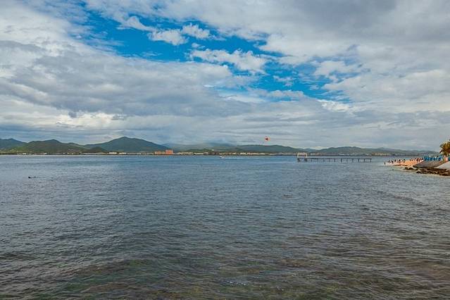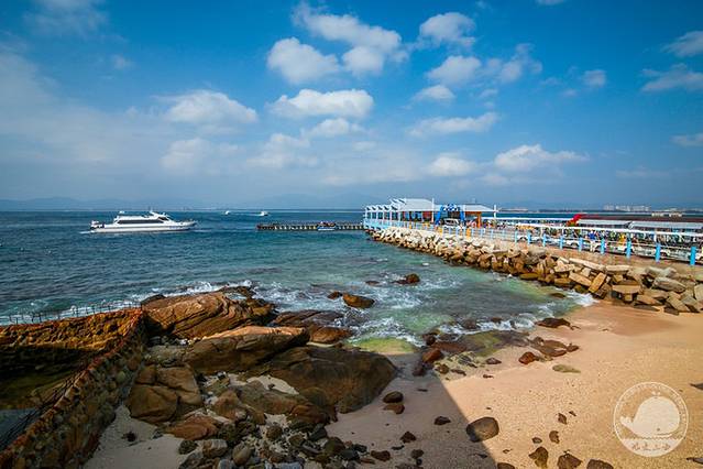 西岛的水上娱乐项目跟蜈支洲岛上是基本一样的,不过价格便宜不少,携程上团购一价畅玩是790,门票、船票、娱乐项目全部都包含在里面了。所以从性价比考虑的话,西岛是第一选择,连房东小郑也是推荐我们要玩水上娱乐项目的话,选西岛。其实对于一个常住在三亚的人来说,反正也习惯了海边的风景,自然推荐更具性价比的。站在西岛上,近处是看到有人在玩拖伞,远处对面就是三亚湾,貌似还可以看到我们的住房~