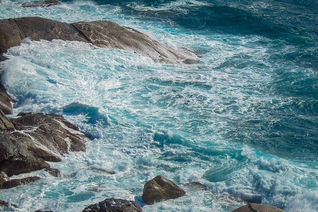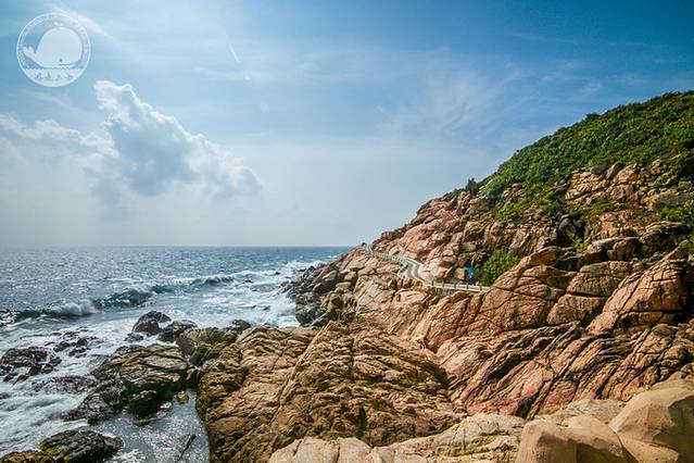 游览车行驶的是一条沿着山体边修筑的石板路,一边靠着山崖,一边紧贴大海,足以饱揽大自然的壮丽。对,是壮丽,这个词真的太贴切不过了。晴空、冽风、险崖、沧海。拍起的海浪直逼眼前,偶然还会溅到脸上,耳边的潮声不断,都无时无刻的不在提醒我们,这一切的真实。