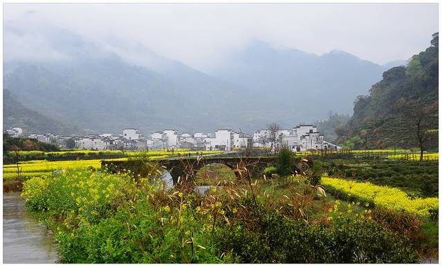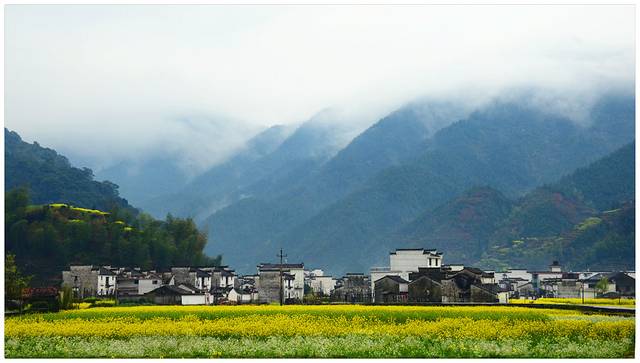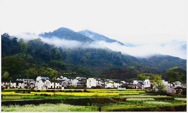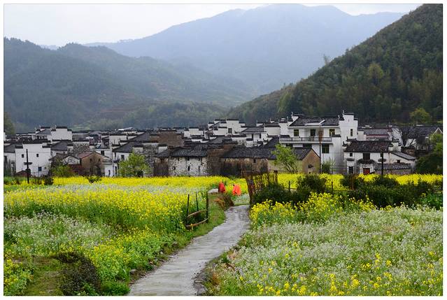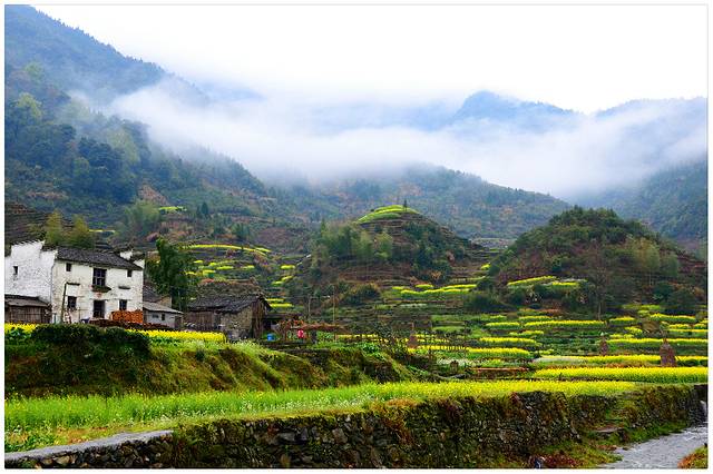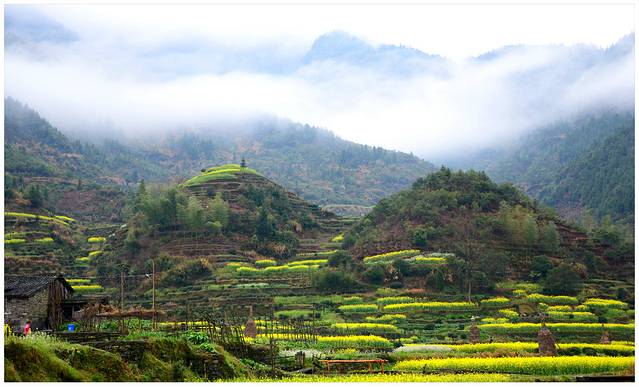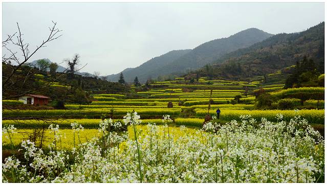 薄云+花海+青山+泉水+篱笆+白墙黑瓦+欢乐。