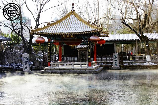 五龙潭到趵突泉就隔了一条马路,走出五龙潭到对面去就是趵突泉,看趵突泉因为是天下第一泉,冬季去趵突泉的泉水也不是很大。趵突泉是公园内的主景,泉分三股涌出平地,泉水澄澈清洌,泉的四周有大块砌石,环以扶栏,可凭栏俯视池内三泉喷涌的奇景。在趵突泉附近,花墙子泉、卧牛泉、漱柳絮泉、皇华泉、杜康泉等三十多个名泉,构成了趵突泉泉群,济南也就是泉城。泉水可以直接饮用,冬天泉水的供应也停止了,但是在泉里还是可以用杯子接的。