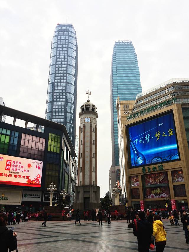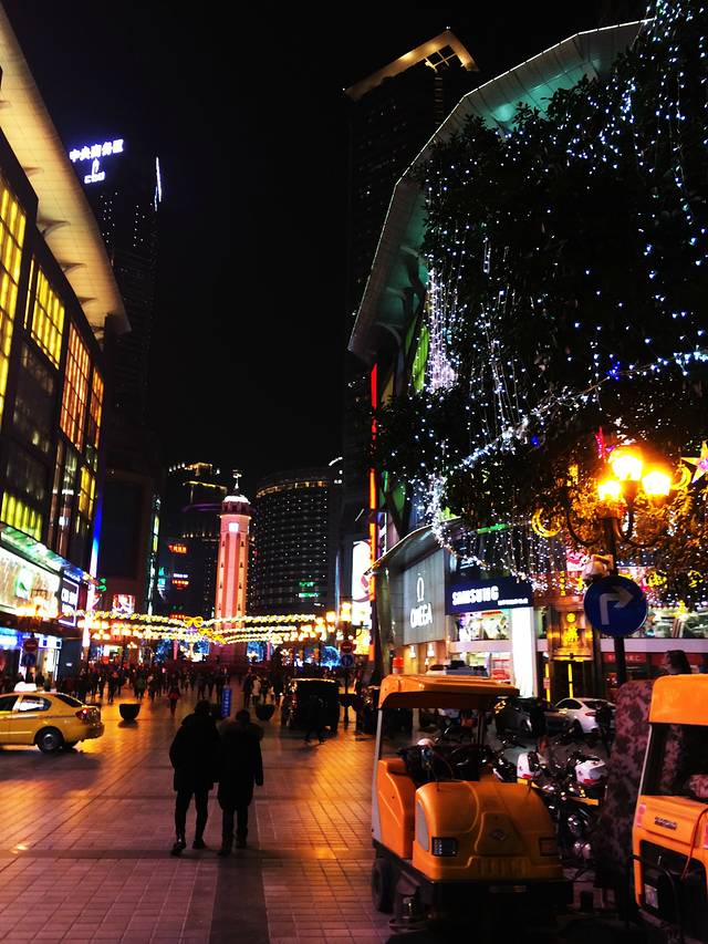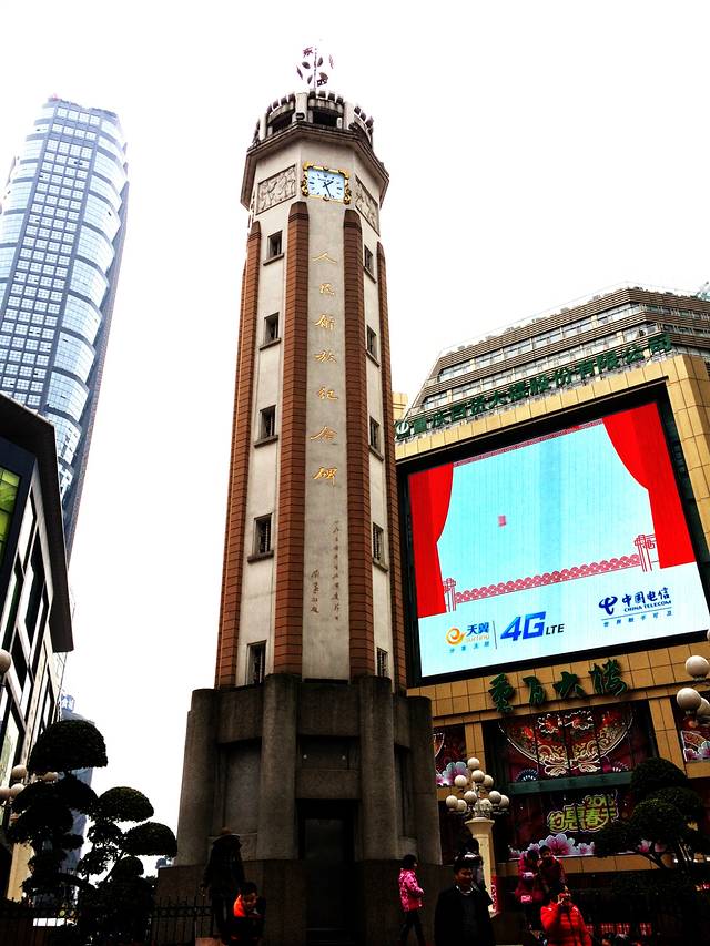 来到重庆的人基本上都会来解放碑合照一张。纪念碑顶部有几面大钟,朝着不同的方向,而每到正点,钟声都会响起。还是比较赞的,如果正点到那,你就可以看到啦。 来解放碑你可以找到好多还玩好吃的,以解放碑为中心的十字路口,辐射出东西南北的四条步行街。晚上步行街上的夜景不错,步行街上有高档的商场、酒店,也有各种小吃店等。 解放碑的地理位子不错,八一路好吃街就在附近,离洪崖洞也不远,还有著名的朝天门火锅。走累了,就近休息一下,寻找美食,这边上吃的很多,还有很多卖特产的店铺,想要买特产的也可以看看。 其实参观解放碑最好的时间是晚上,晚上的景色特别好,树上基本上都是灯,也是重庆市民夜生活开始的时候,整个解放碑区域就是人流最扎堆的地方