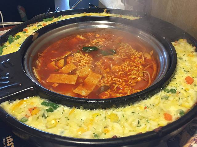 逛完公园来弘大随便吃点又要开始逛街啦!!也是随便进的一家店。是部队锅自助。8000韩币一个人。味道也不错!!