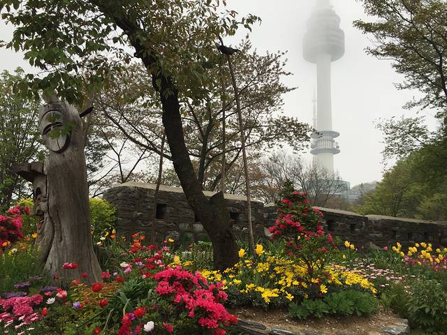 吃完参鸡汤来到首尔塔,需自行买票登塔。但是这么大的雾什么也看不清,虽然我们提前在淘宝买了票,但觉得灯上去什么也看不到就在底下转了转。