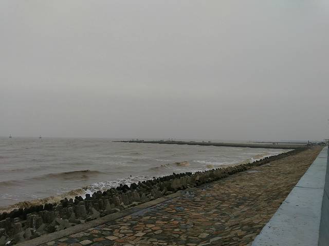 这儿的海水黄黄的,很是混浊,看上去比现今的黄浦江水要赃得多;海堤虽长,但值得走的也就那么一段,且还停满了机动车,漫步海堤,并不是很畅和很爽;是时海风不大,微风轻拂,海水拍打着海岸,海风吹在身上蛮舒服的。
