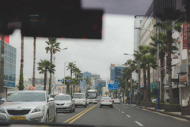 透过免税店的落地窗看济州岛的街道。