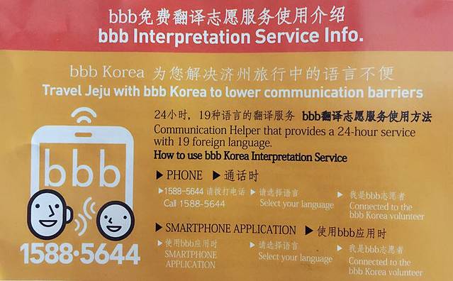 语言翻译:因为韩国人英文不是很好,带的韩国腔有时候也不是很能听懂或者说自己本身英语就不好,济州岛会有免费的电话翻译服务,很贴心,这是我在快结束旅行时才发现的。