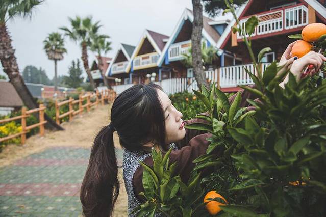 在度假村的小路上,边走边摘橘子。居然还有一匹济州马。马看到有人来了,主动靠近,一点也不认生。