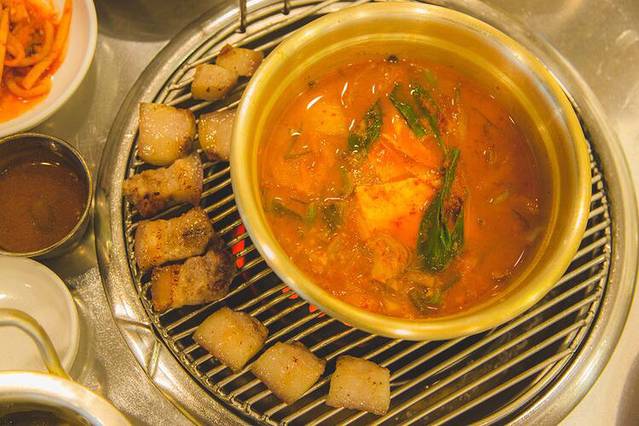 烤完黑猪肉,再热上大酱汤,他们家的大酱汤也是一绝,据说是在汉挐山海拔1100米高地发酵的名牌泡菜与大酱。