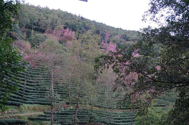 第二天一早,天边刚泛出鱼肚色,我就起来,等我整理完,几个摄影爱好者己不见踪影,自己就凭着感觉到二号景区去游览,来到这片神奇的土地上时,被这梦幻般的景色迷住了,那满峡谷的淡雾,如轻纱曼舞在山间游荡,那满山的樱花树在淡雾中若影若现,像一幅幅油画,真是美极了,当太阳从云缝中透过来时,霞光万丈,那樱花树在蓝天白云下亭亭玉立,在霞光照耀下泛着娇嫩的粉红色,和山上的茶树交相辉映,层层叠翠,红绿相间,是那样的醒目鲜艳,绚烂的冬樱花争奇斗艳,摇曳生姿。粉红色的花,白色的云雾,绿色的茶园,娇艳的樱花错落有致,那景色无以伦比,如同一棵棵红宝石缀落在绿毯上,美轮美奂,让人迷醉之间,远远望去,一株株樱花与层层茶田相得益彰,谱写着绿茶红樱相恋相守的浪漫乐章。真是美景藏在深山无人知,在这么一个深山峡谷中会有如此美丽的景色,此景美不胜收,构成一幅迷人仙境。望着那绽放的冬樱花,开得恣意,开得欢腾,如难得一见的繁英绚烂,就在这个冬天自由盛放。苍翠茶园相伴,幽幽山谷相守,此处正是最孤芳自赏的美好地方。若遇晨雾缭绕,只在迷蒙微光间泄露那红粉的娇俏,就像是欲出仍遮面的段誉口中的神仙姊姊,不需人识,只能偶遇。